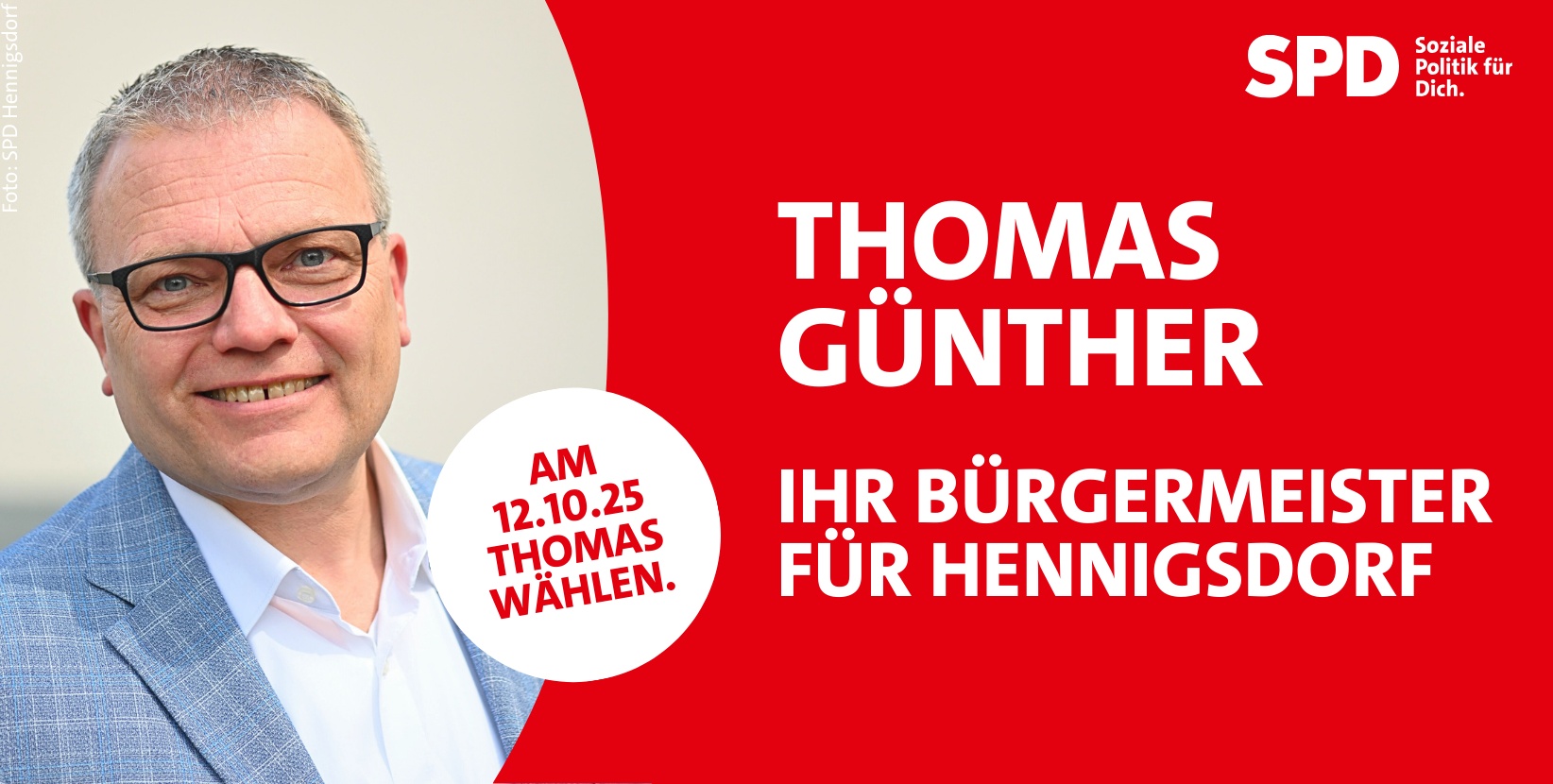 Seit 2018 macht sich Thomas als Bürgermeister stark für Hennigsdorf. Damit Hennigsdorf auch weiterhin lebenswerte Heimat für alle bleibt, gilt es am 12. Oktober Thomas Günther zum Bürgermeister für Hennigsdorf zu wählen!