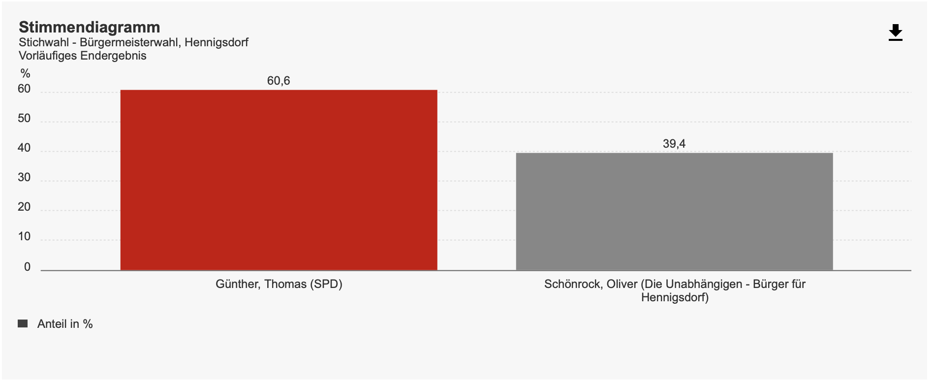 In der Stichwahl für das Bürgermeisteramt konnte sich unser erfahrener Amtsinhaber, Thomas Günther, durchsetzten und wurde mit 60,6% wiedergewählt. Dafür Danken wir allen Hennigsdorferinnen und Hennigsdorfern, die ihre Stimme für Thomas Günther abgegeben haben.