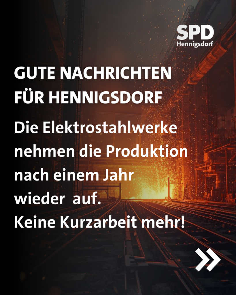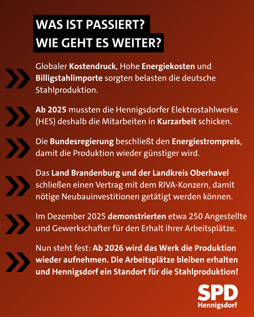 Diese Nachricht ist für uns Hennigsdorfer/innen das schönste Weihnachtsgeschenk: ab dem 01.01.2026 nimmt das RIVA Elektorstahlwerk in Hennigsdorf die Produktion nach einem Jahr wieder wieder auf.
